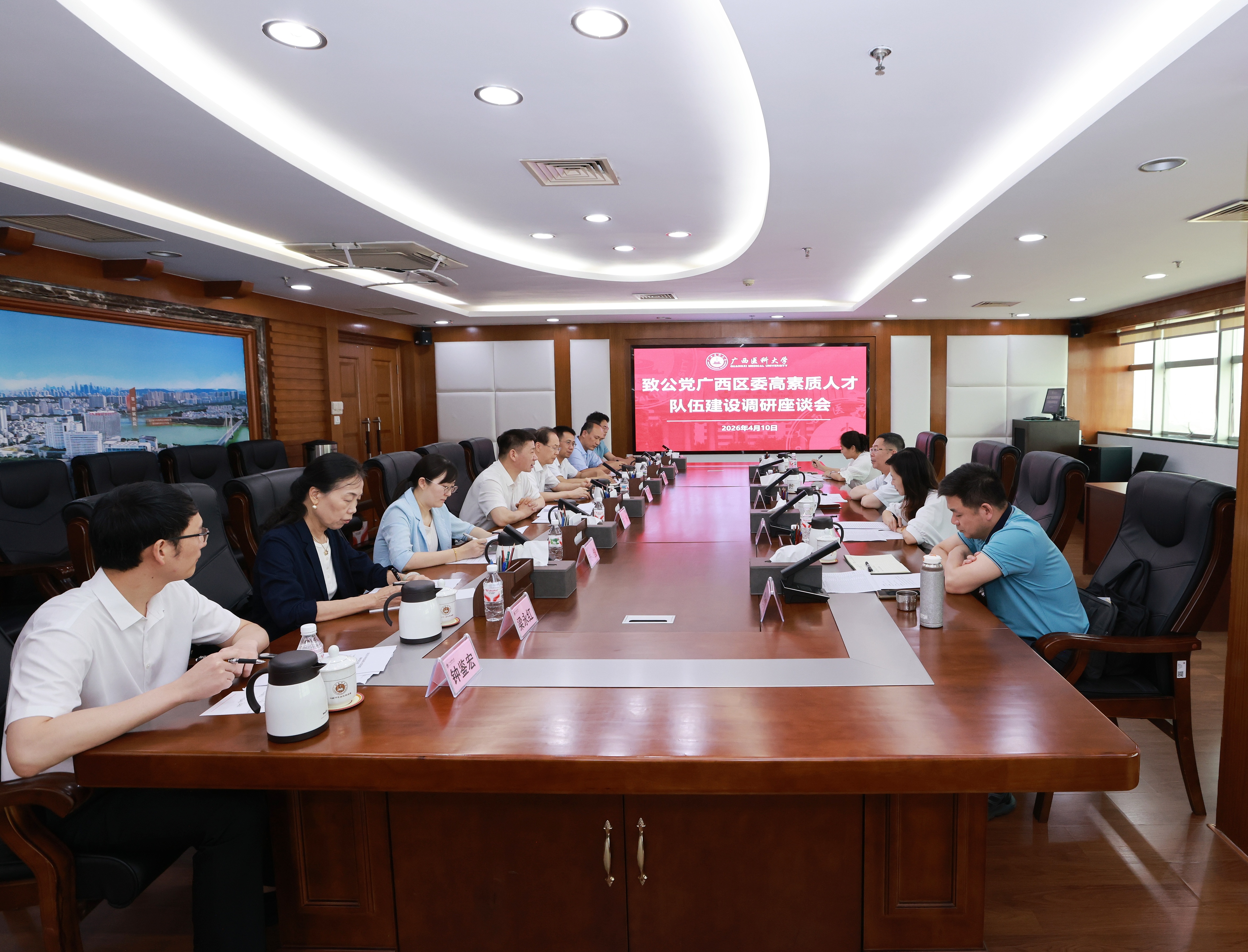 为汇聚人才力量,共同服务国家和区域发展战略,4月10日,自治区政协副主席、致公党广西区委会主委欧余军一行到我校,围绕高素质人才队伍建设进行专题调研。我校党委书记陈川会见了欧余军副主席一行。座谈会在校本部综合楼15楼会议室举行,由党委副书记刘灵光主持。